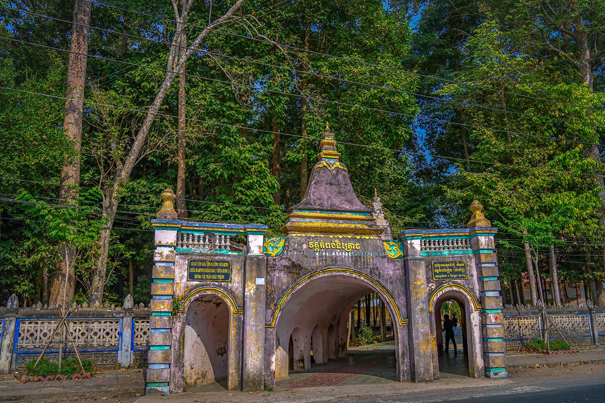 The first thing that sets Hang Pagoda apart is its unusual entrance. Instead of a standard open gate, you pass through an arched structure built to resemble three adjoining caves, with thick 12-meter walls that give it a solid, almost fortress-like feeling. This “cave gate” not only explains the temple’s nickname but also ties back to Brahmanic and early Khmer Buddhist traditions, where caves were places of meditation and retreat.