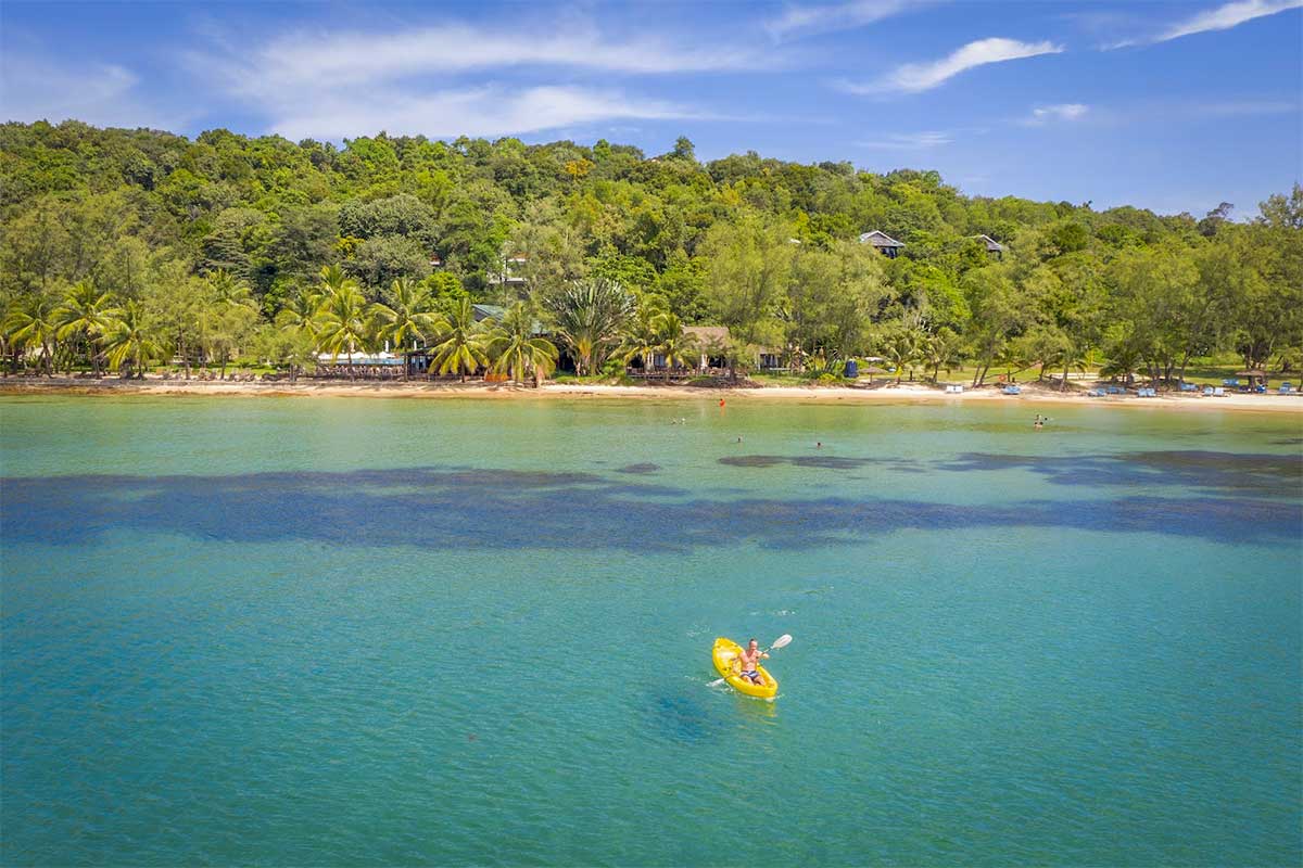 Aerial view of kayaking at Ong Lang Beach Phu Quoc with clear water and green tropical coast