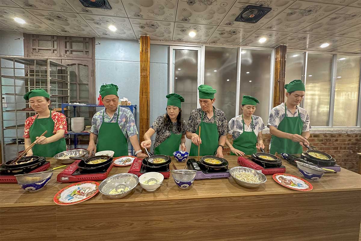 This is the core part of the class. You’ll chop, stir, roll, and fry your way through each dish under the guidance of a local chef. Most classes are very hands-on and suitable for beginners — the chef demonstrates each step, then you repeat it at your own station. You’ll also learn small tips: how to wrap spring rolls properly, how to adjust dipping sauce, or how to balance sweet–sour–salty flavors.
