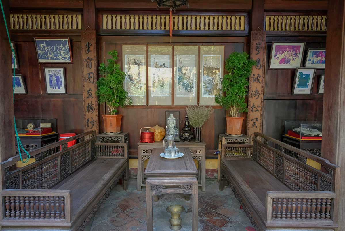 The roof features a unique stacked beam system, allowing overlapping tiles and airflow while keeping the house cool. Decorations include calligraphy, ancestral photos, and carefully preserved antiques, offering a lived-in feel that adds to the authenticity.