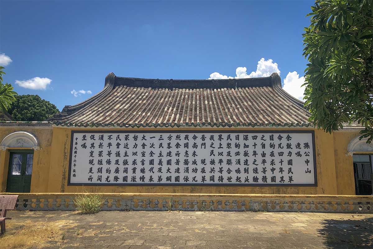 Notable elements include a plaque with Sun Yat-sen’s will, honoring his influence, and a memorial to local resistance fighters who operated from this site during wartime.