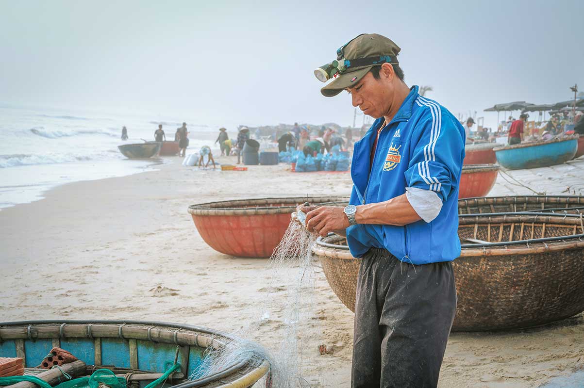 Along the edges of the beach, small food stalls serve steaming bowls of mì Quảng or bún bò for the hungry workers. Women wash out buckets in the surf. Fishermen mend nets and push boats up the sand, already thinking about the next trip out. It’s raw, real, and completely captivating.
