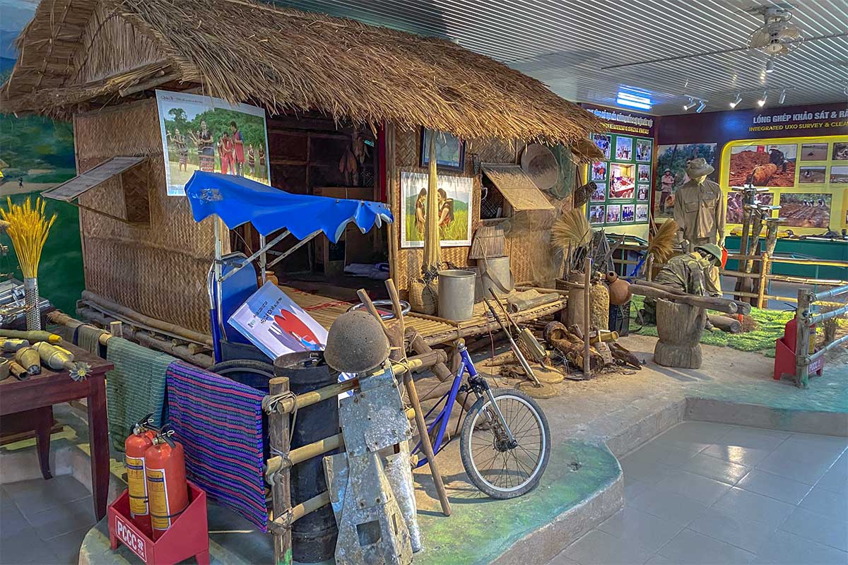 The first displays focus on the Vietnam War and its legacy in Quang Tri. Photographs show the destruction of the province, including the ruins of Quang Tri Citadel, alongside images of local people trying to disarm bombs with little more than bamboo sticks. Lifelike models of munitions and real pieces of unexploded ordnance (UXO) illustrate the types of weapons that still turn up in fields and villages today.