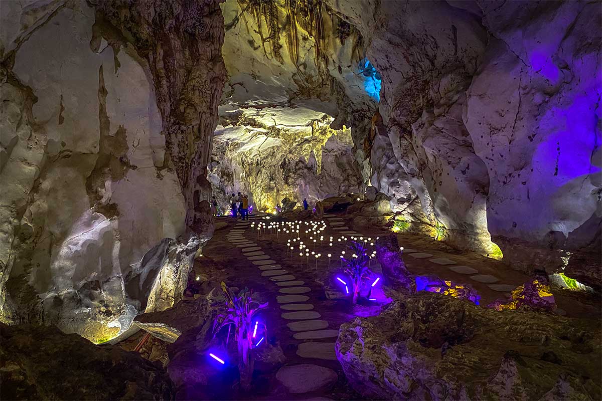 At the end of the bridge, you’ll reach a small limestone cave known as Chim Than, or “Holy Bird Cave.” It’s a short stop with colorful lighting and some interesting formations—not very large, but a nice way to end the bridge walk.