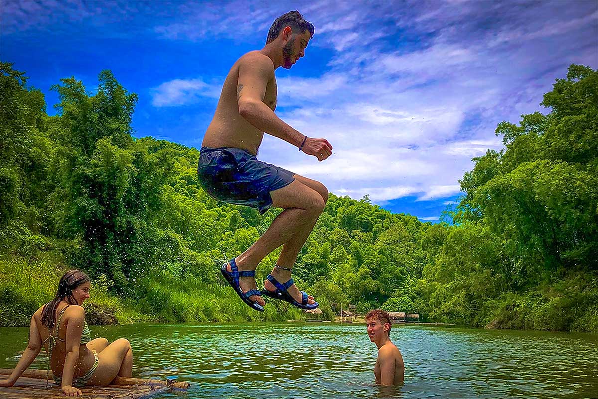 This peaceful activity gives you a unique view of local life. On a handmade bamboo raft, you float gently down the Cham Stream, passing rice fields, fishing nets, and several of Pu Luong’s iconic bamboo water wheels. The stream is calm and narrow, with jungle-covered hills rising on either side.