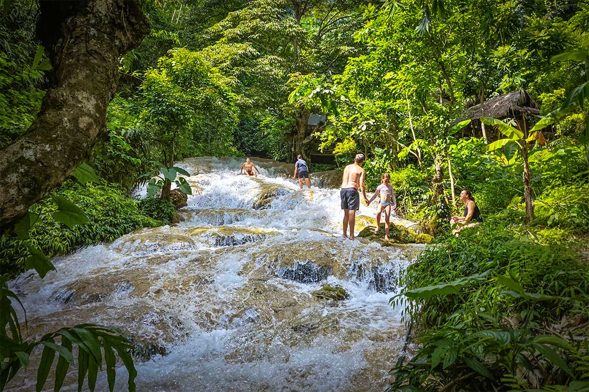 The most scenic swimming spot, however, is Hieu Waterfall. Hidden in a steep valley, the waterfall flows down in multiple steps through the jungle, creating natural pools along the way. It’s a short but steep walk from Ban Hieu village — which itself is one of the most beautiful areas in Pu Luong. You can relax, swim, or sit on the rocks while watching the water cascade through the forest.
