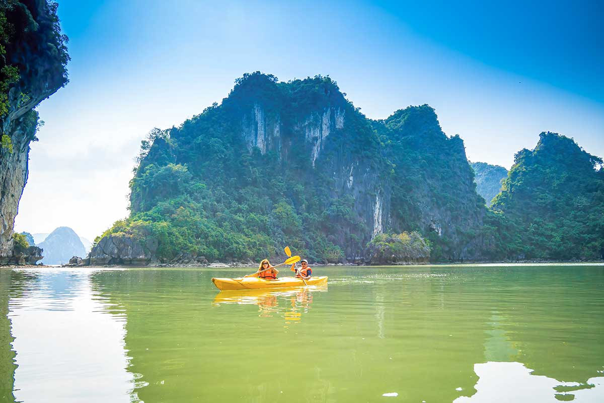 Leave the city behind and head towards the peaceful waters of Lan Ha Bay, a lesser-known but equally stunning extension of Halong Bay. After boarding your boutique cruise, enjoy a freshly prepared lunch as you pass limestone islands and floating villages. In the afternoon, explore the bay by kayak or relax on a secluded beach. End the day with a sunset view, a cooking demonstration, and dinner on board.
