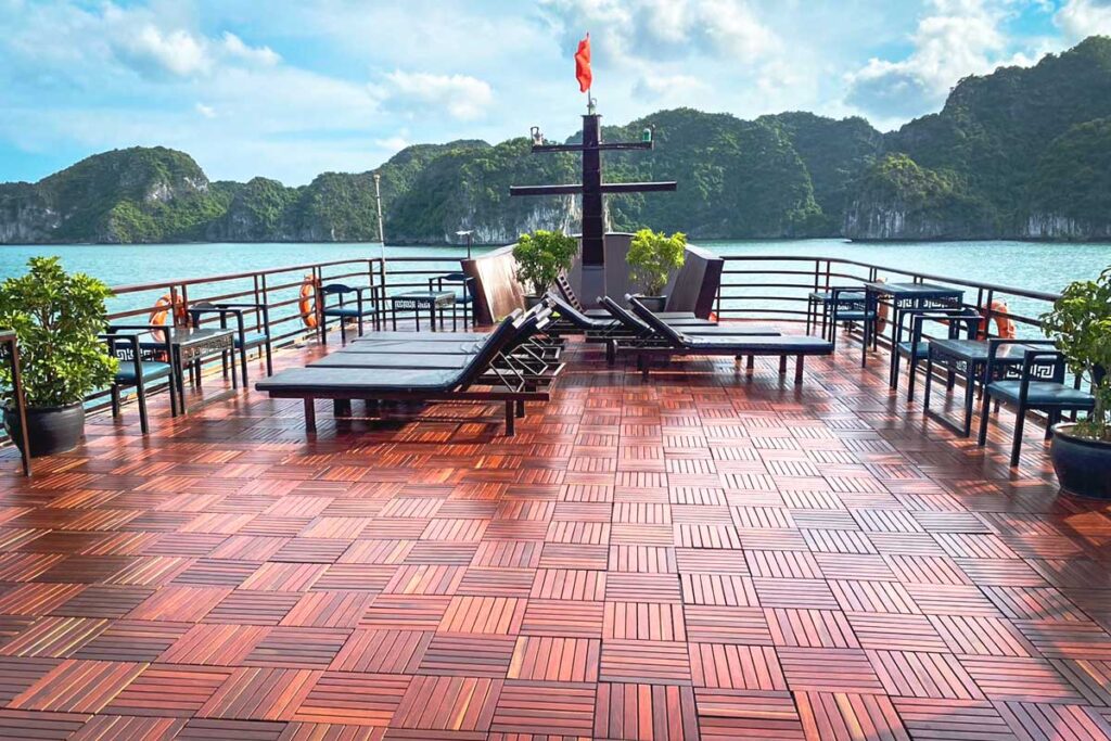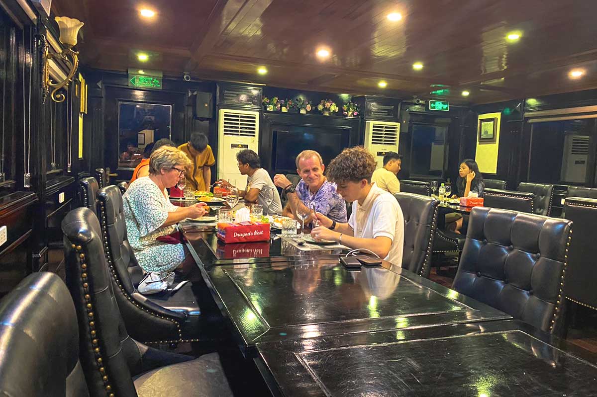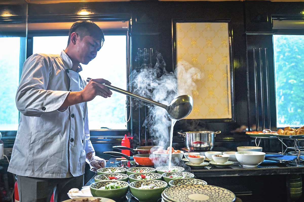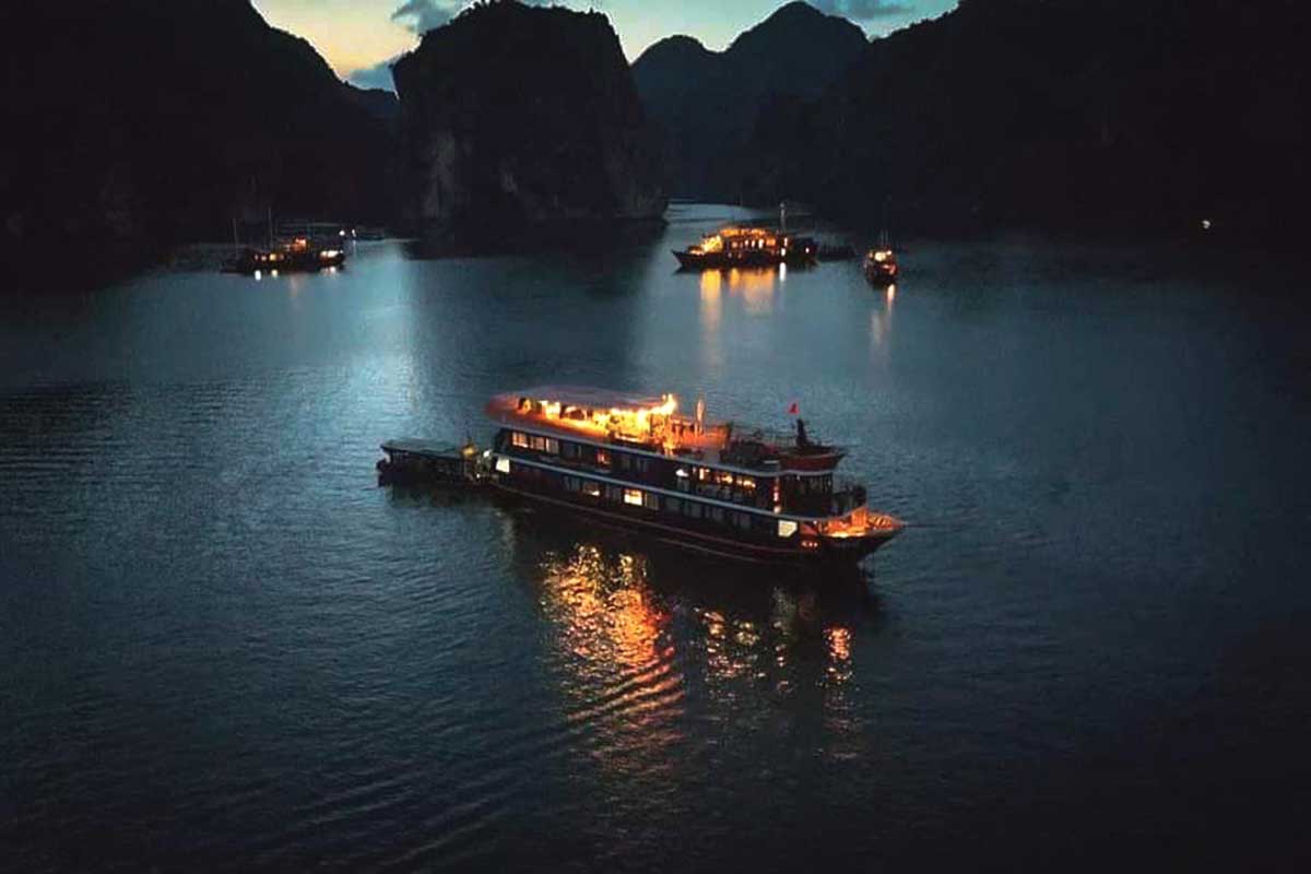 Return to the boat to relax on the sundeck during sunset. Then, join a hands-on Vietnamese cooking session before sitting down to a delicious dinner onboard.