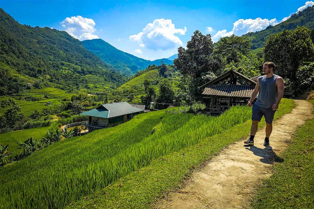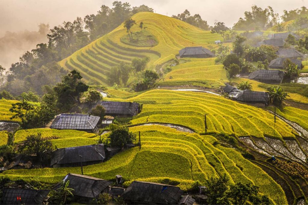 After breakfast, lace up your shoes and start your full-day trek. You’ll walk through layers of terraced rice fields, small trails through the forest, and ethnic minority villages surrounded by misty peaks.