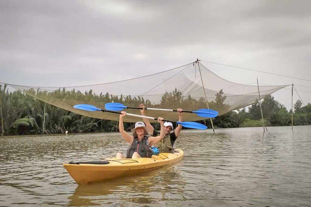 After cycling, switch to a kayak and paddle into the peaceful waterways of the Cam Thanh coconut forest. This area is part of a mangrove ecosystem and still home to traditional fishing methods. You’ll pass by basket boats, bamboo traps, and see local fishermen and women working along the riverbanks. The paddling is calm and beginner-friendly, offering a unique view of local river life.