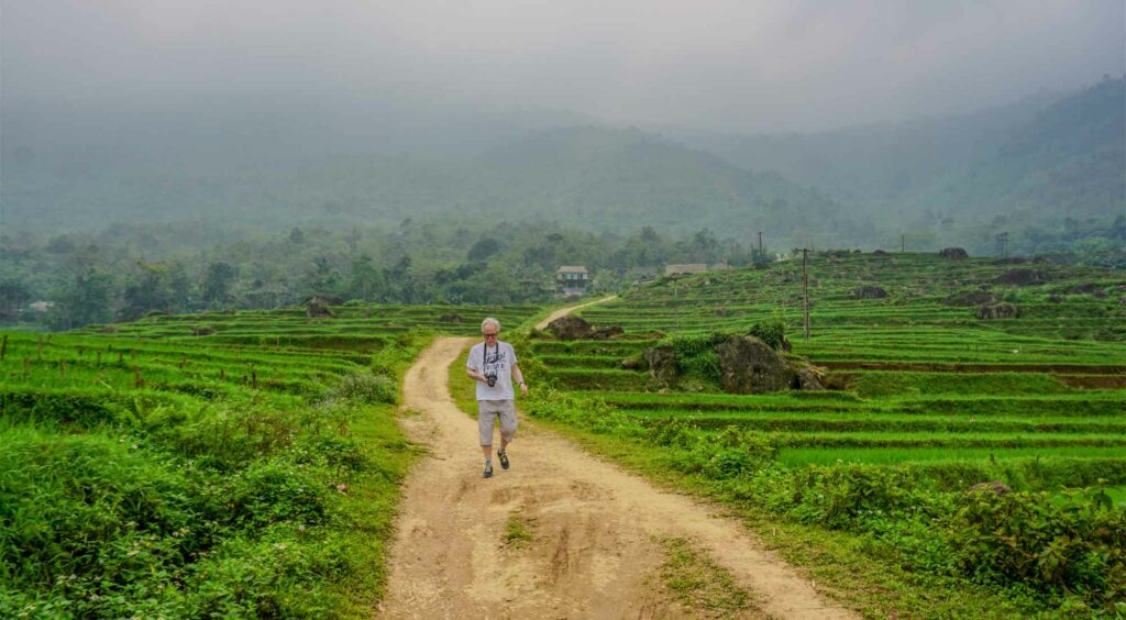 After lunch and a rest, your guide will take you to the starting point of your first walk. Cross a hanging bridge over the Cham River and wander through Ba Village, where you’ll see traditional stilt houses and everyday life. The walk continues past bamboo waterwheels—clever handmade systems used by the Thai minority to irrigate their fields.