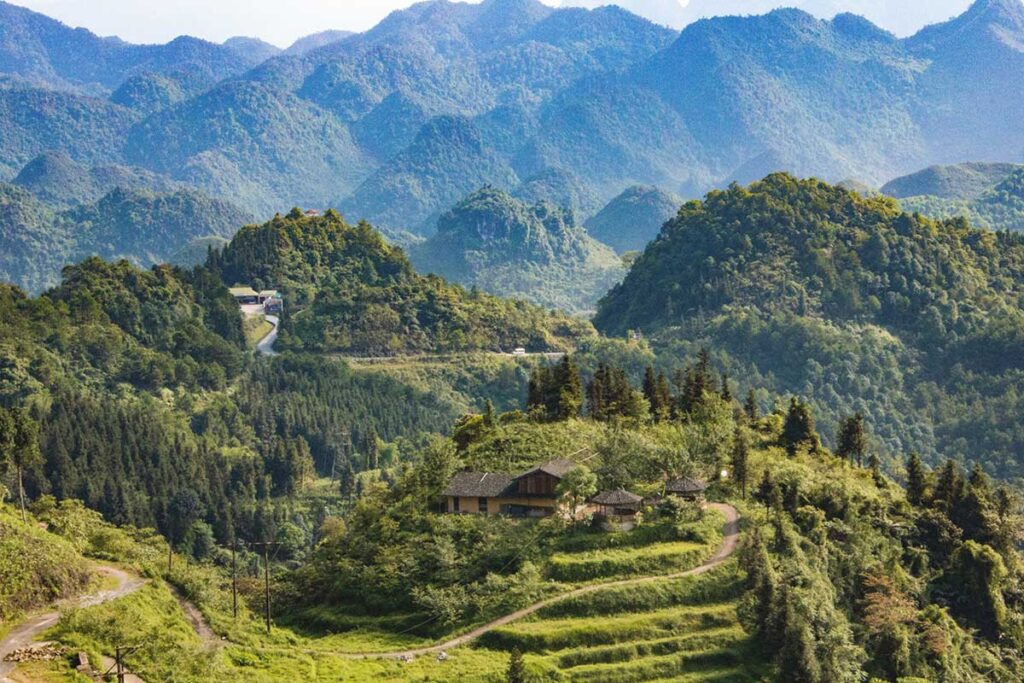 Dong Van Cliffside House sits on a dramatic mountainside overlooking the rocky karst landscape of Dong Van Plateau. The property features simple, locally inspired architecture that blends stone, wood, and open terraces designed to match the rugged surroundings. Its remote setting makes it a practical stop if you want to stay close to nature while exploring Dong Van town and nearby highland routes.